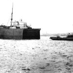 On April 4th, the now crippled Suevic was made seaworthy. Travelling astern by the assistance of the tugs Blazer, Herculaneum, Linnet and Ranger, the ship now set off on her journey towards Southampton. At the same time, a new bow was being constructed in the yards of Harland & Wolff. When completed, this 212 feet bow section was launched head first, and it was jokingly said that the Suevic was the longest ship in the world, her stern being in Southampton and her bow in Belfast. The bow was then towed to Southampton by the Pathfinder and Blazer on October 19th, 1907.