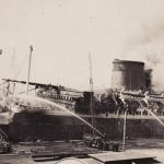 The year of 1937 was to be the last full year for the Lafayette. On May 4, 1938 the Lafayette was being overhauled at Le Havre. Accidentally, oil had been spilled on the furnace room floor and it started to burn when the furnaces were being filled. The fire quickly spread to one of the fuel tanks and soon the situation was way out of control. Within short, the fire had destroyed the electrical switchboard, which resulted in that all the lights failed. This made fire fighting all the more difficult, and soon every man with a common sense realised that the Lafayette was doomed. At about 12 am, the heat became so intense it exploded compressed air chambers in the engine room. The poor Lafayette suffered these explosions until 4 am, when they finally ended. The burnt out shell of the former luxury liner could not possibly be of any use to the French Line. They sold the ship to breakers in Rotterdam to where she was soon towed.